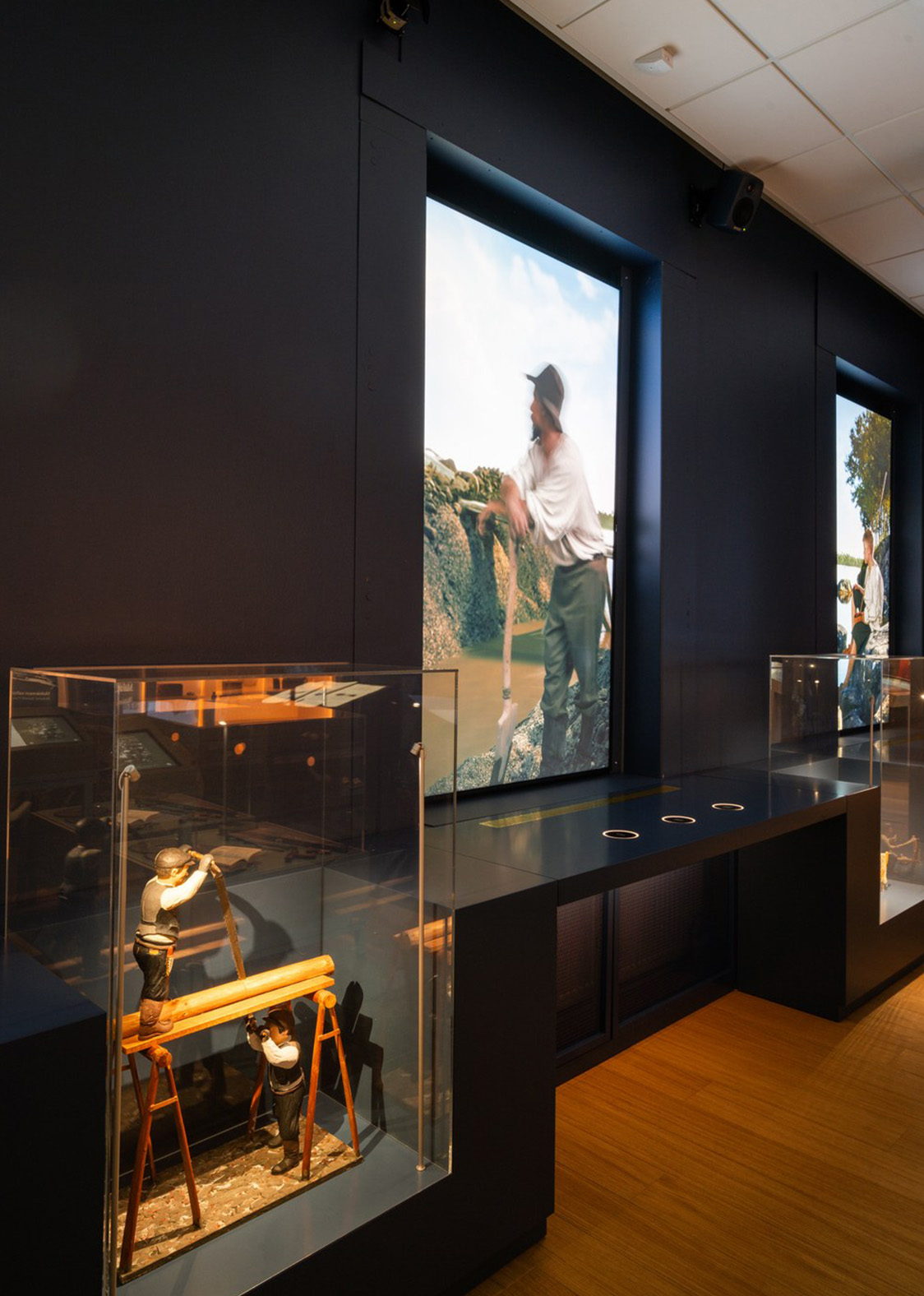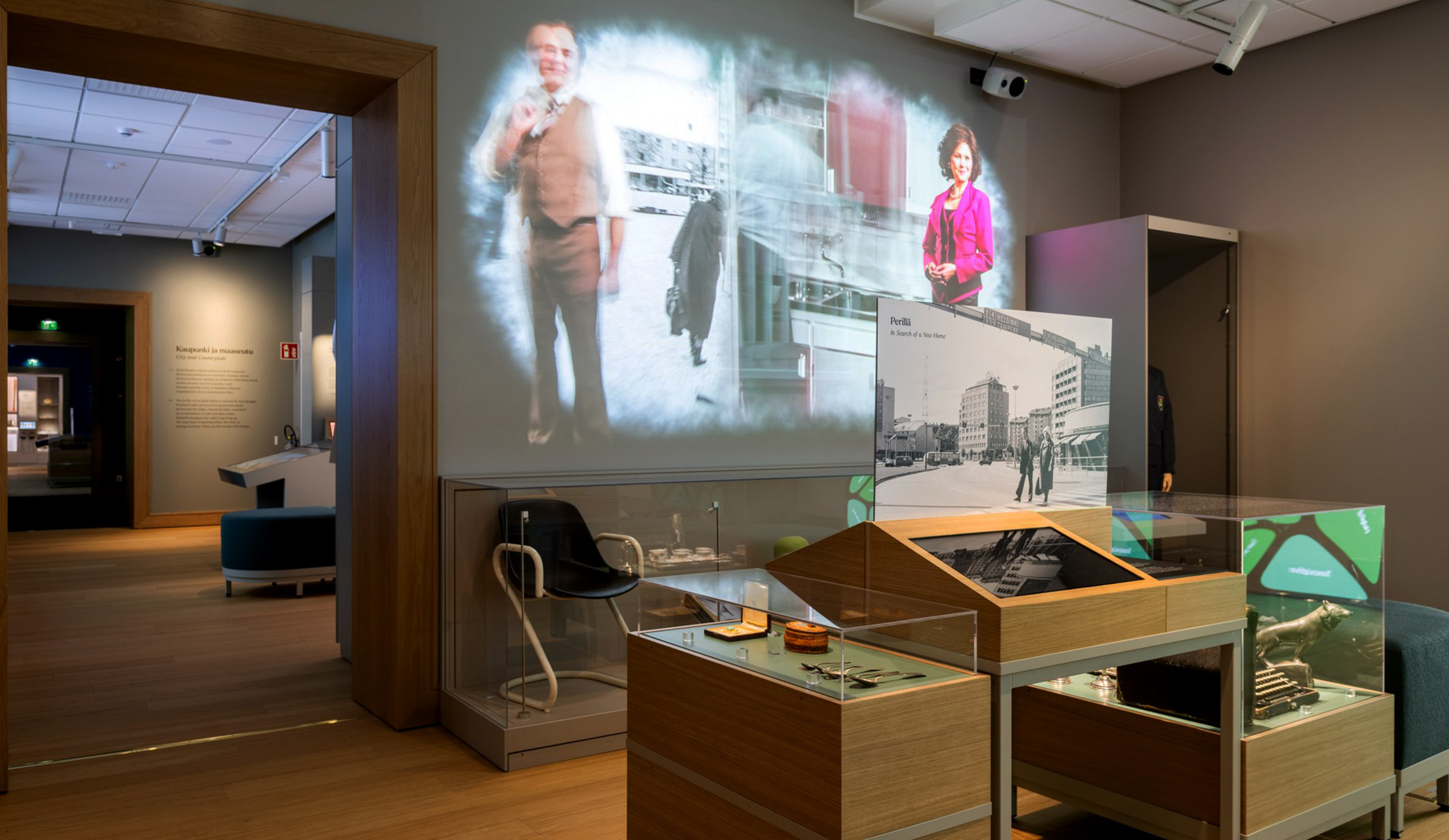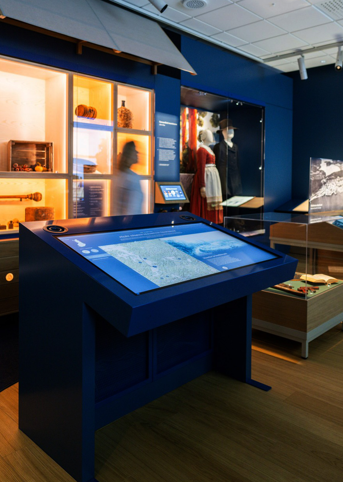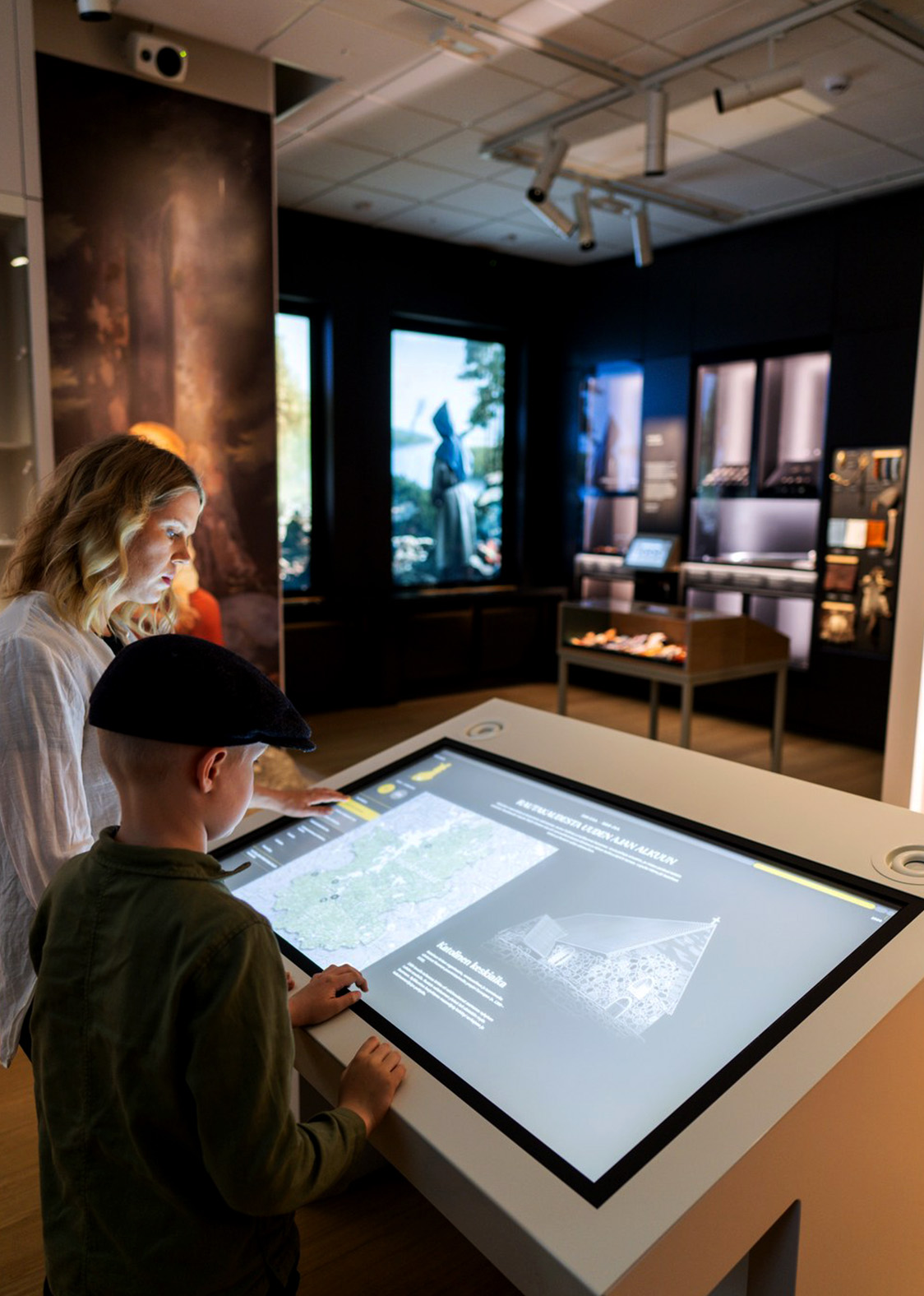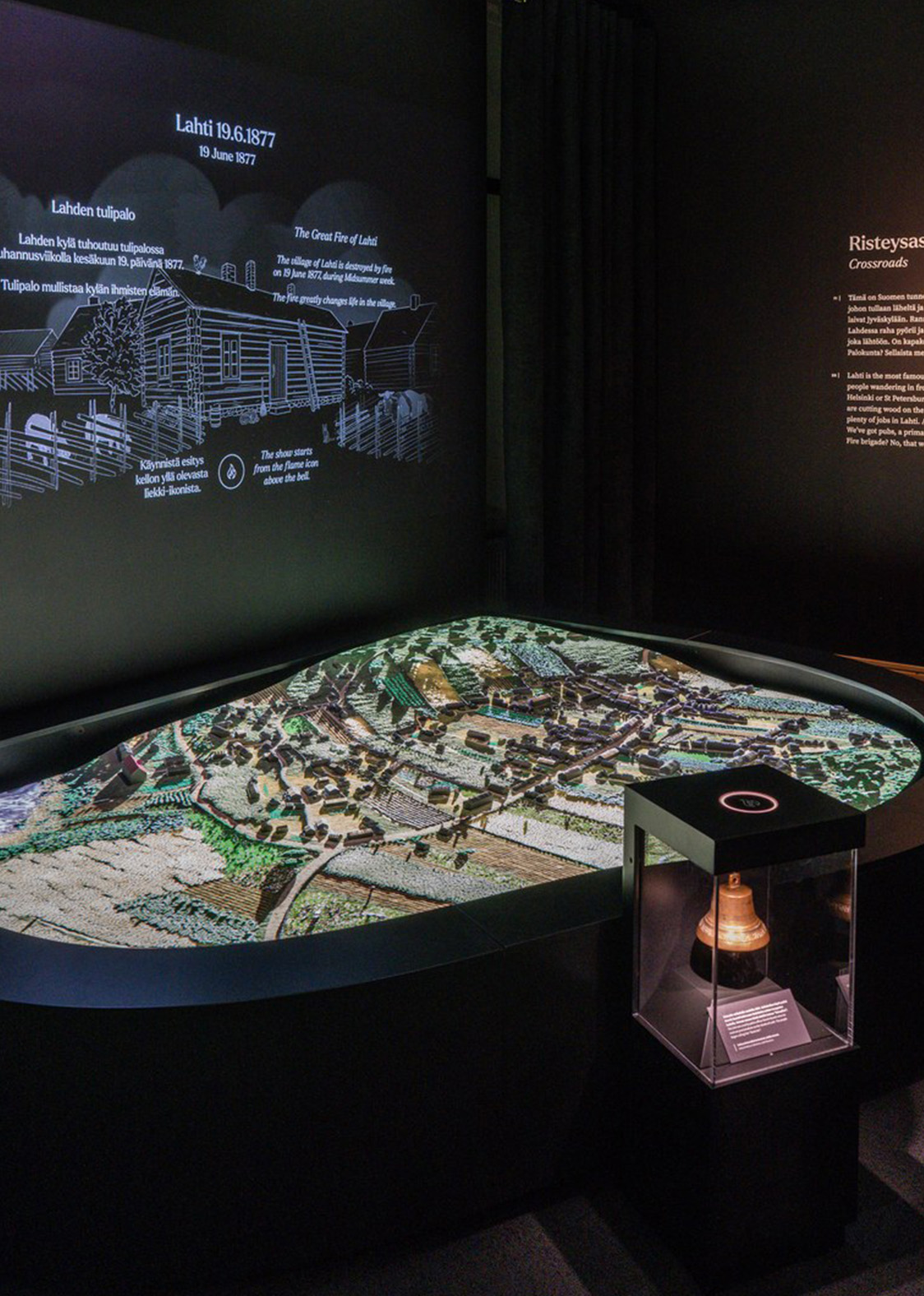 The exhibition can be explored through physical or digital means, either by casually browsing or delving deeper into selected information. Alongside immersive storytelling, the exhibition offers diverse opportunities for information dissemination, considering the needs of different target groups. Each room features touch screens that provide various perspectives on the cultural heritage of the Lahti area.