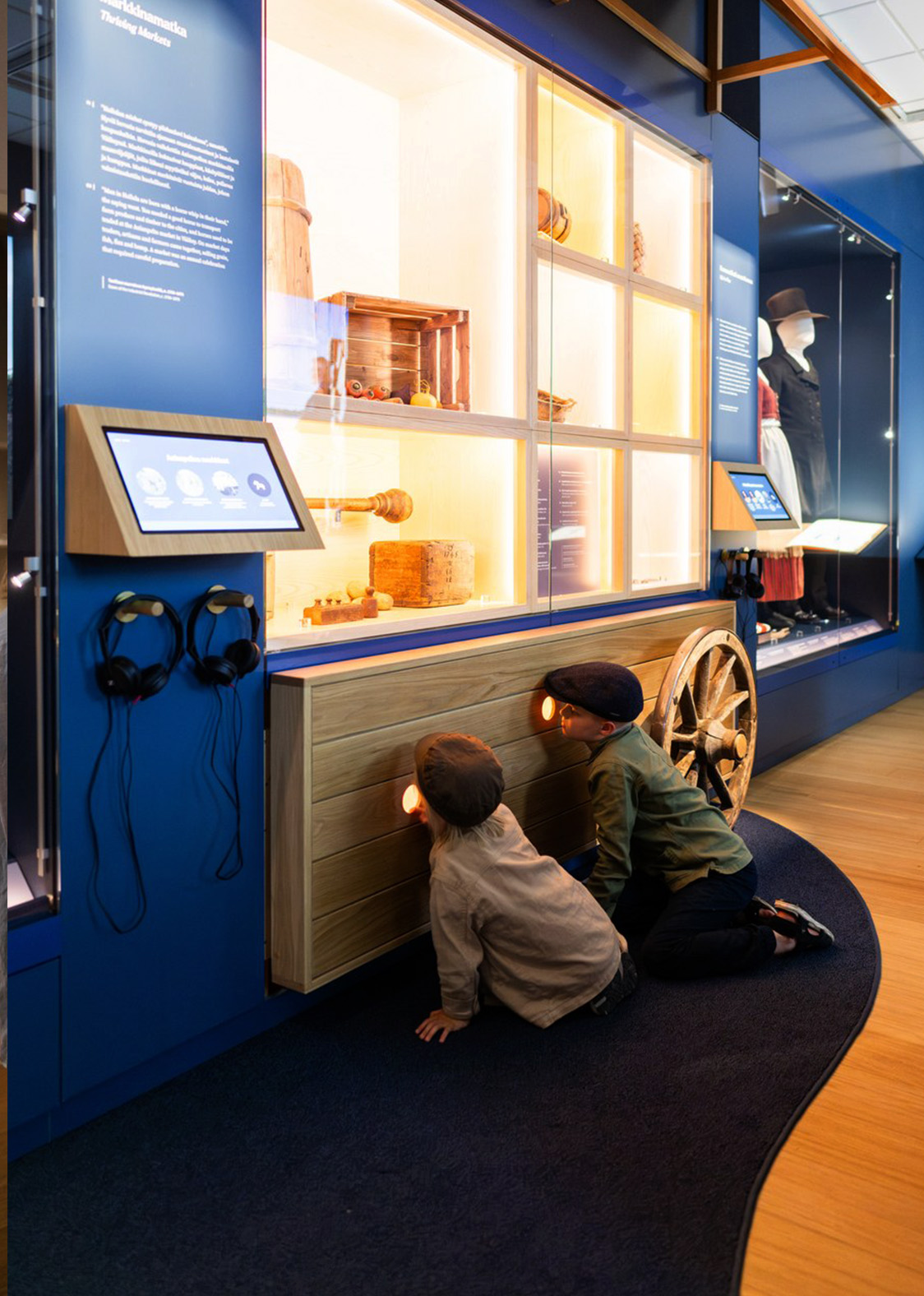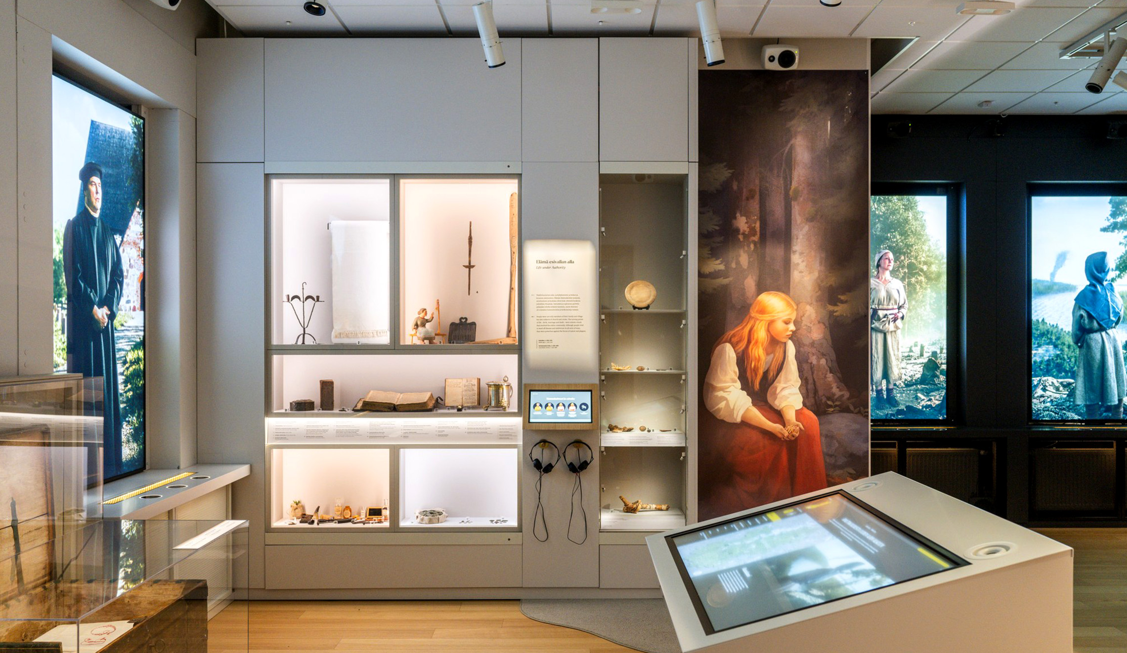 The historical setting of the museum building is utilized in the exhibition by dividing the space into six sections with different themes according to the room layout of the manor. Each room features strong distinct themes and atmospheres created through choices of colors and materials, lighting, soundscapes, and various immersive elements. A key element in each room is the digital windows, which open up views to past times through interactive screens embedded in the window recesses. Through the windows, visitors can look into the eyes of characters from different eras and learn about their daily lives and experiences through touch-activated content.